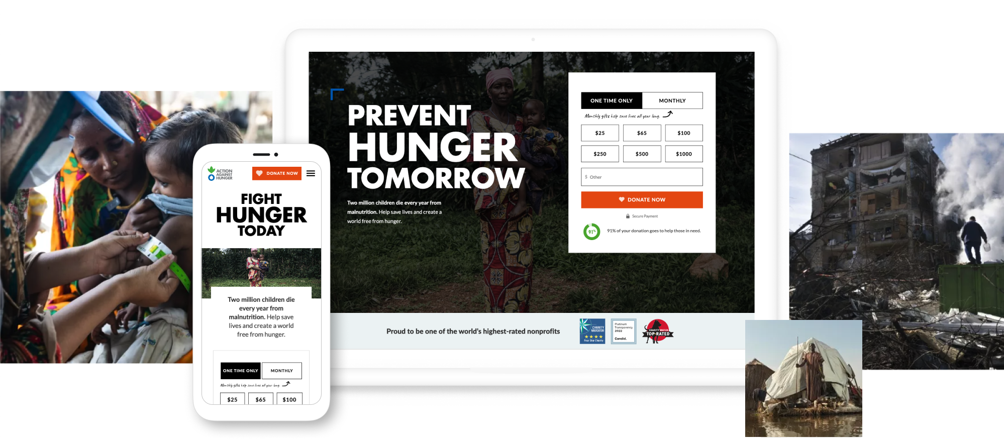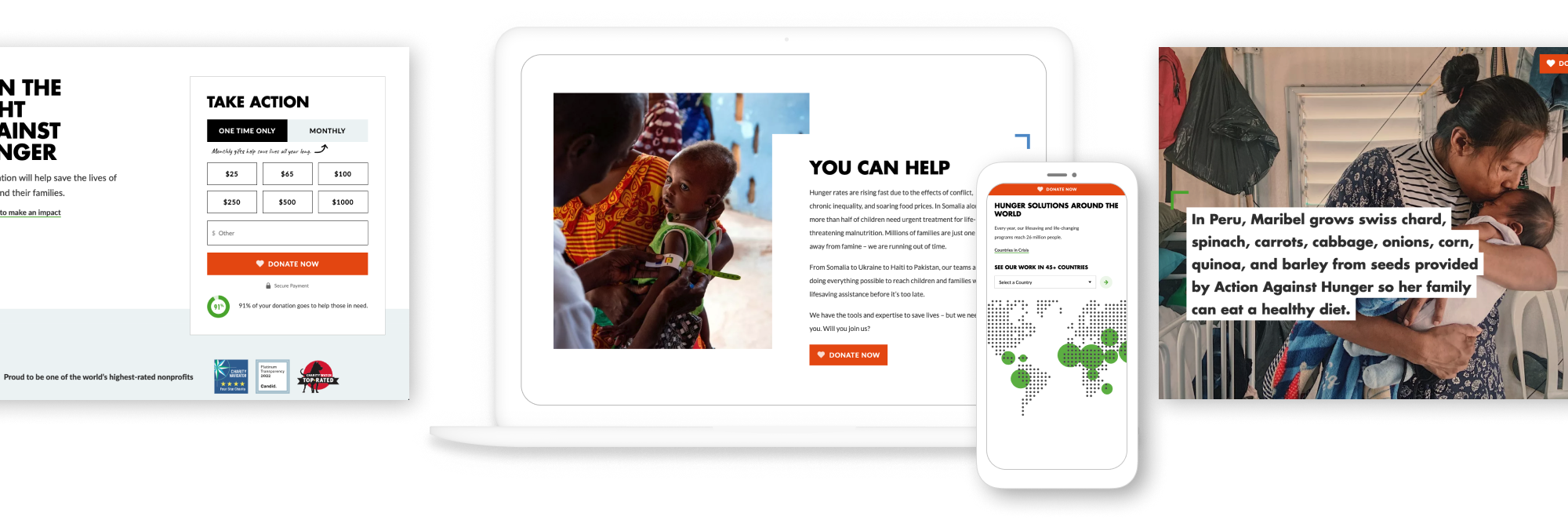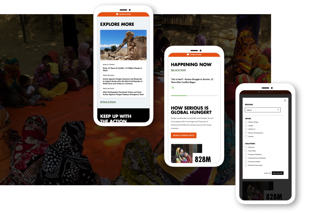 Our strategy phase focused on two key areas: keyword research to inform a new site architecture and editorial plan, and a new messaging strategy that would connect with US audiences. We leveraged the findings of our keyword research to optimize the existing site content so that it would better support search and SEO, and create clear pathways to guide site users to critical context about the hunger crisis and Action Against Hunger’s impact. Since the launch, the new site has driven a significant increase in donations, revenue is up 21% YOY. And, a keyword and optimization strategy is ensuring that Action Against Hunger appears in the top search engine results for highly competitive keywords, including ‘world hunger” and “what is hunger.”
