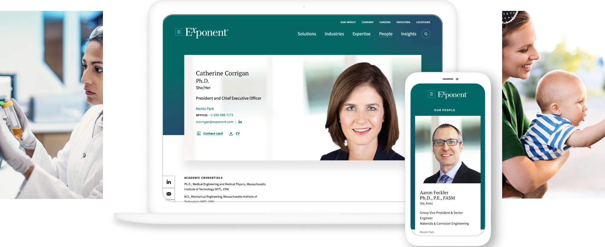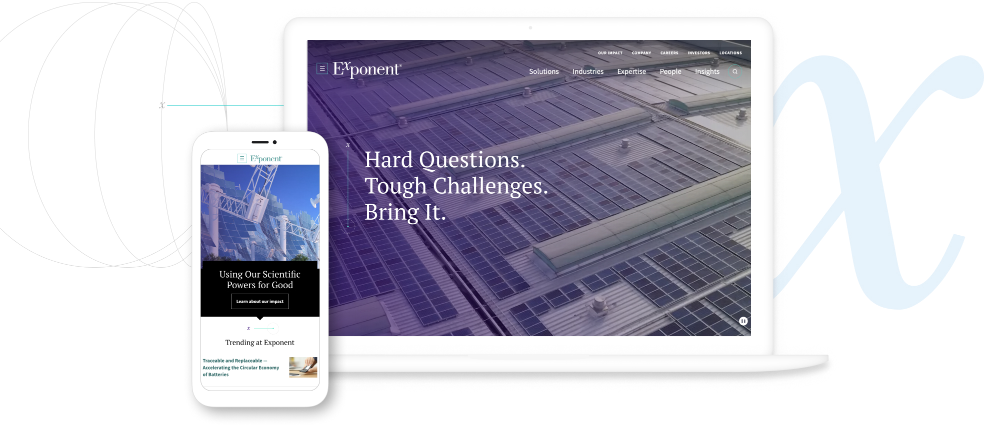 Exponent’s messaging inspires its visual design. A standout new logotype, dubbed the X Factor, features a superscript ‘X’ to convey superior scientific sophistication. The supporting design system attracts attention without detracting from content. Colors, typography, iconography, photography, and videos are striking but scalable, making it easy for the Exponent team to execute across platforms.