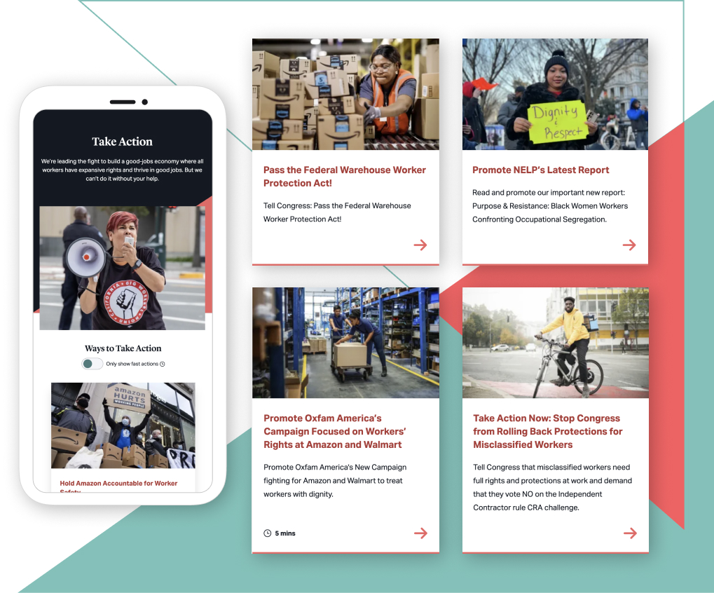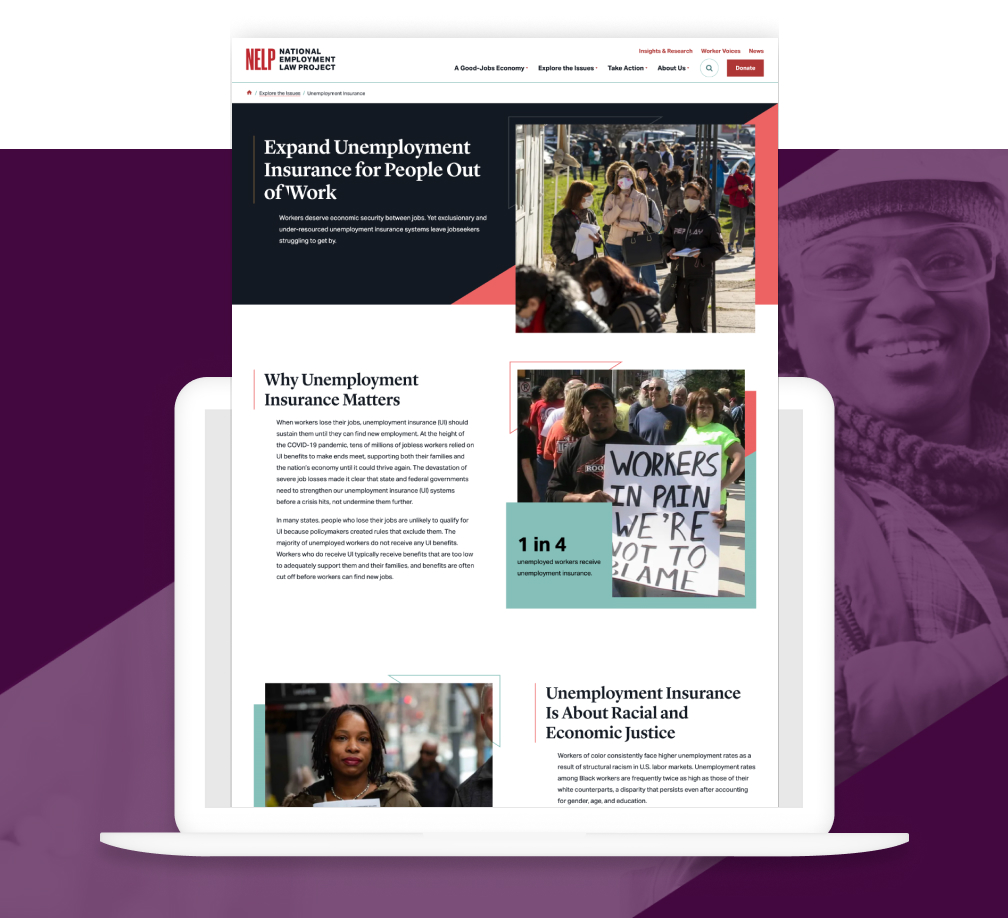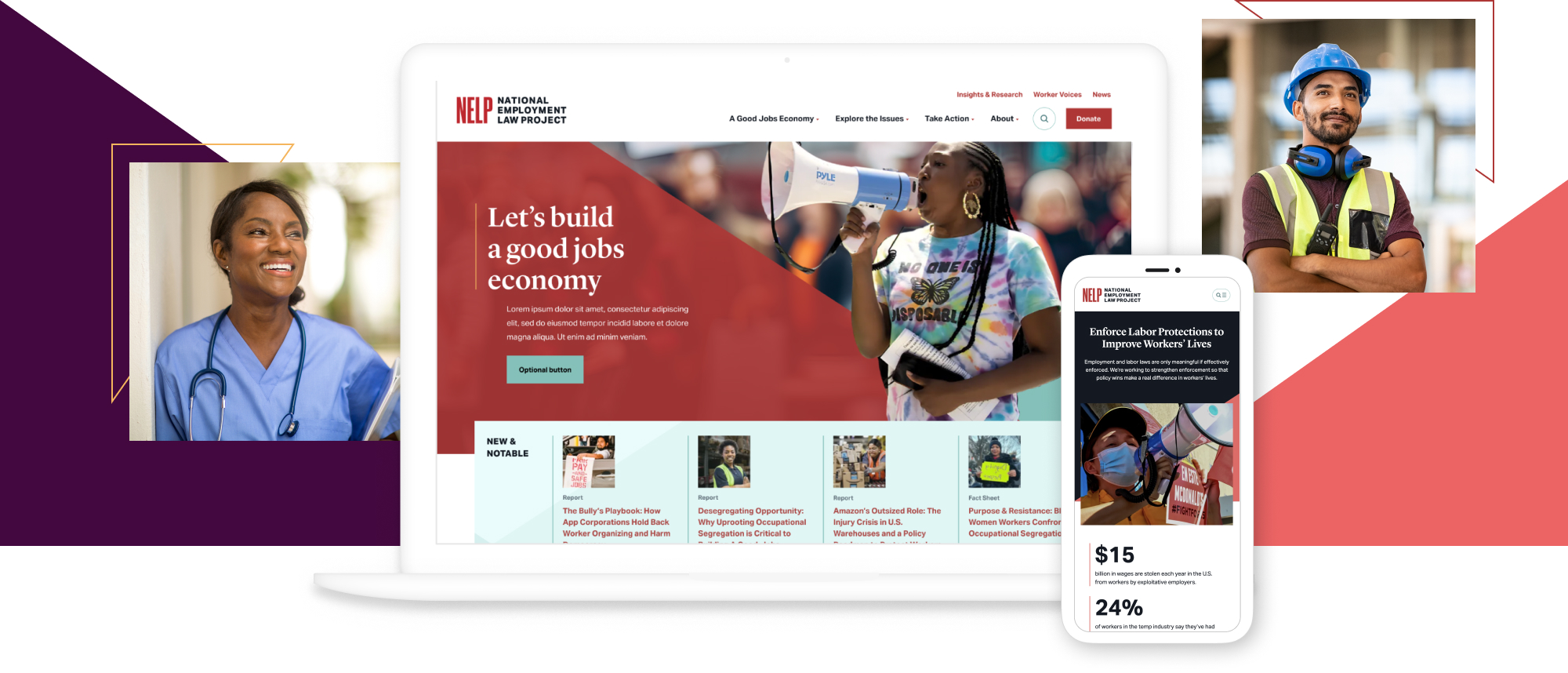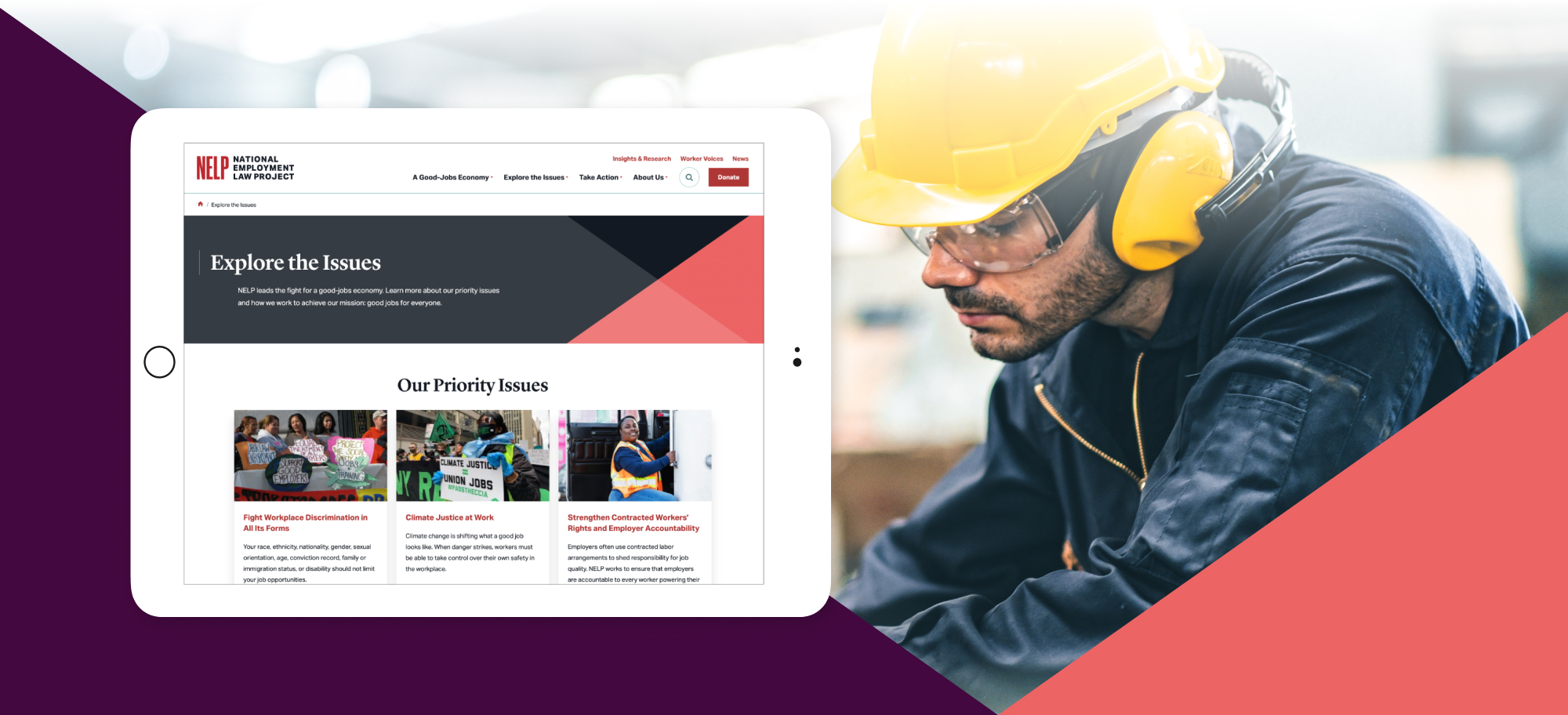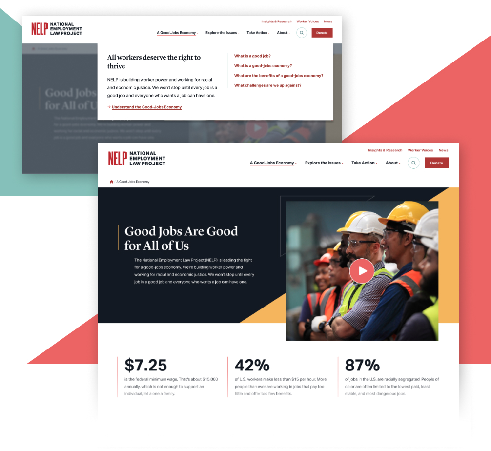 Understanding and explaining why your organization exists is a key part of creating a website that achieves your goals. During our conversations with NELP, we found that a “good-jobs economy” is the heart of their work. Once we defined their why, everything else fell into place. We even included the phrase “good-jobs economy’ in their main navigation so that site visitors are immediately connected to NELP’s mission.